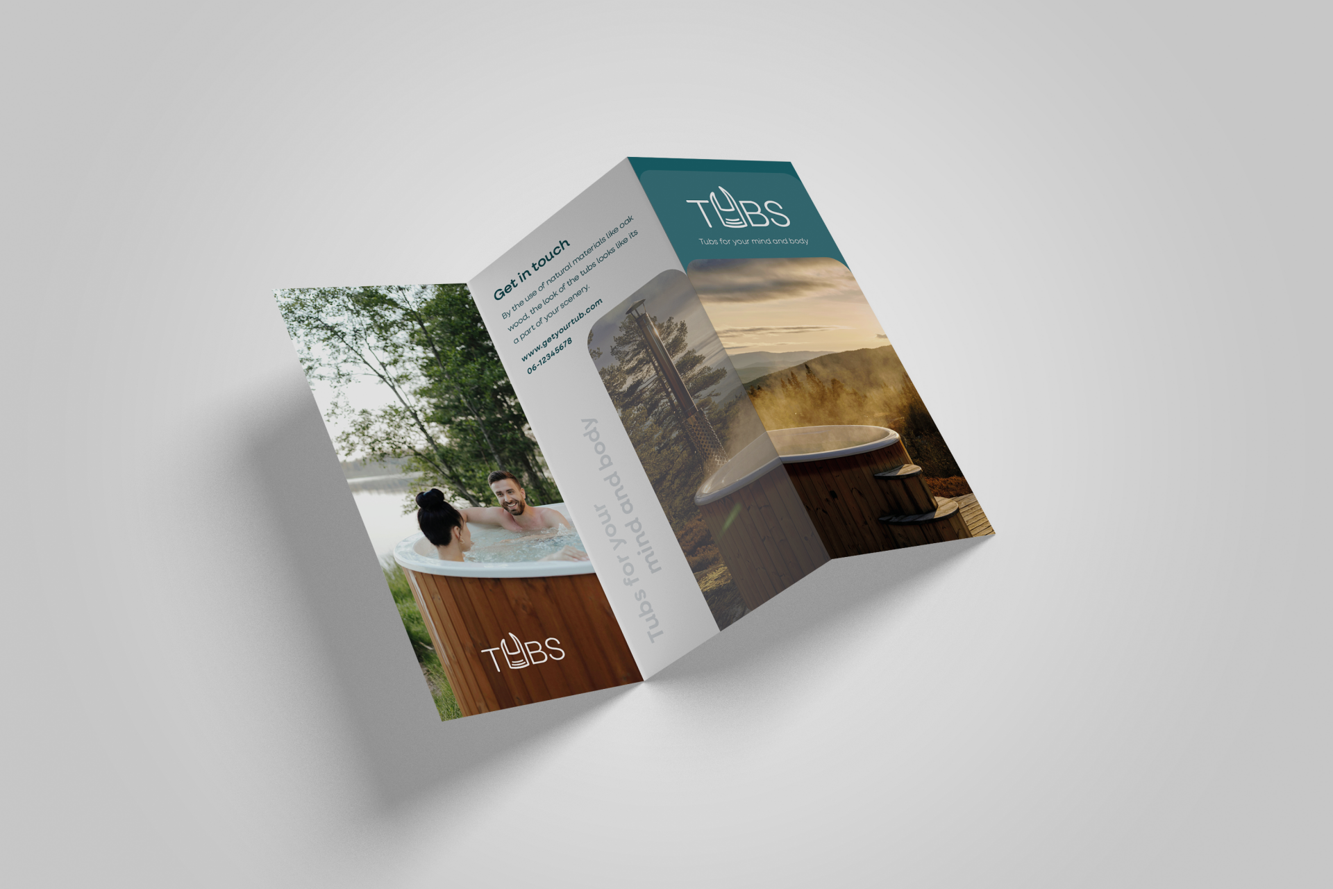 Het bedrijf 'Tubs' verkoopt hottubs waar ik de branding voor heb ontworpen met passende brochure.